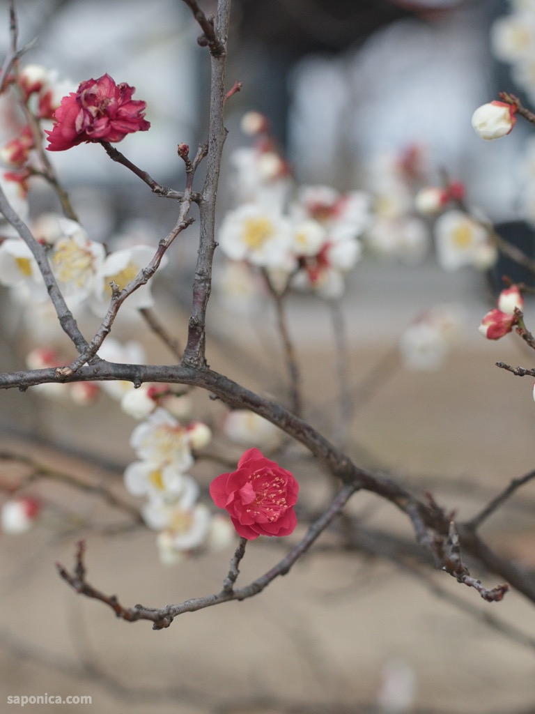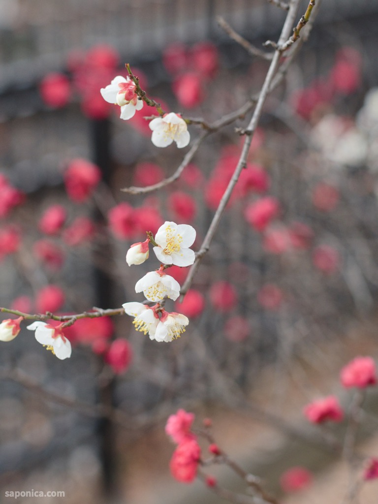 写真を撮りながら梅の花の道を歩いていると、ふと赤と白の梅の花が目に留まった。よく見るとその紅白の花は一本の木から出ていて、枝ごとに赤と白に分かれている。不思議な梅の木もあるもんだなと、帰って調べてみると、どうやらそれは「源平咲き」という咲き方らしい。