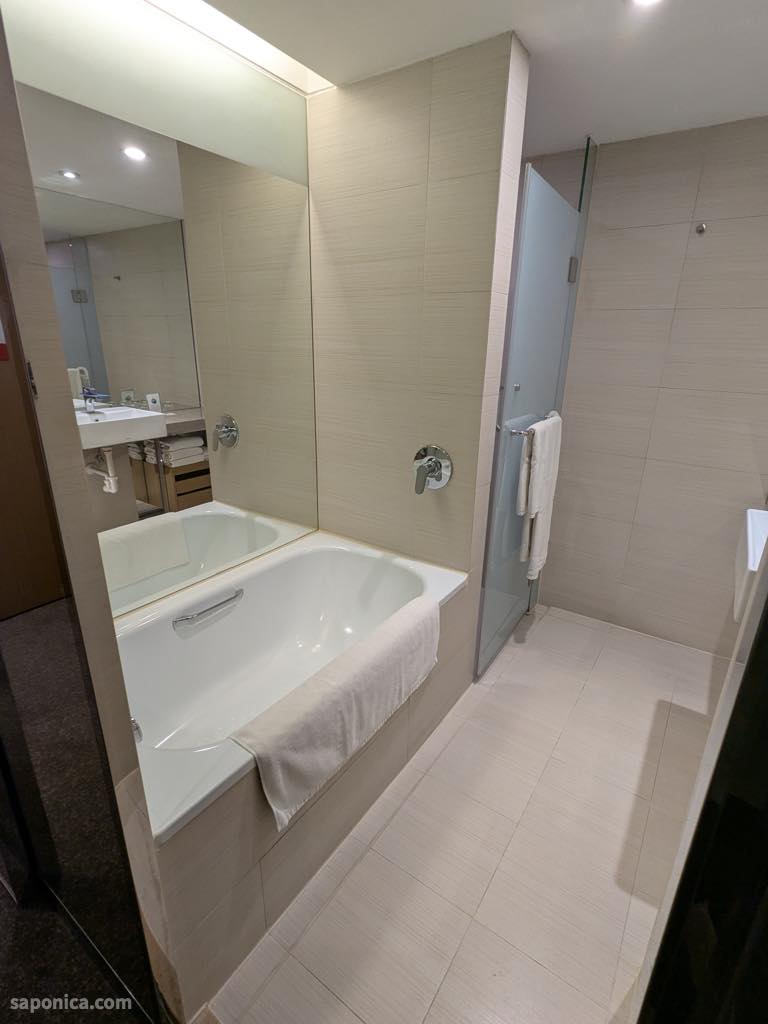 バスタブ付きの浴室はシャワー室とバスタブが別々になっていて、洗うのと浸かるのが別々にできるのはちょっとうれしいかも。シャワーの水圧は弱くはないけど、強くもなくちょっと物足りないくらい。