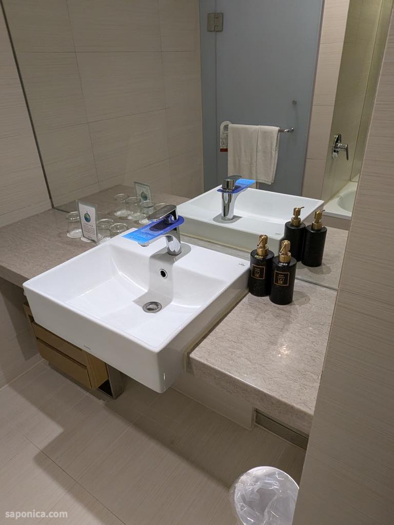 その他部屋についてたものを挙げると、浴室、洗面にはシャンプー兼ボディーソープ、コンディショナー、ハンドウォッシュ、ボディーローション、ドライヤー、グラス。トイレにはハンドウォッシュが。その他アメニティについては必要ならフロントで購入するシステム。