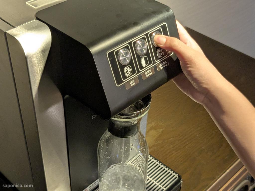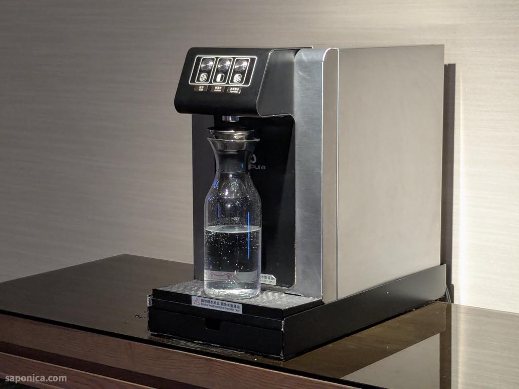 飲料水は、フロアにお湯と水と炭酸水まで出るサーバーが設置されていて、部屋のカラフェを持って行って入れるようになっている。台湾旅行には自前でウイスキーなどお酒を持っていく人も多いみたいだが、これがあれば部屋で気軽に水割りやハイボールが楽しめていいのではなかろうか。