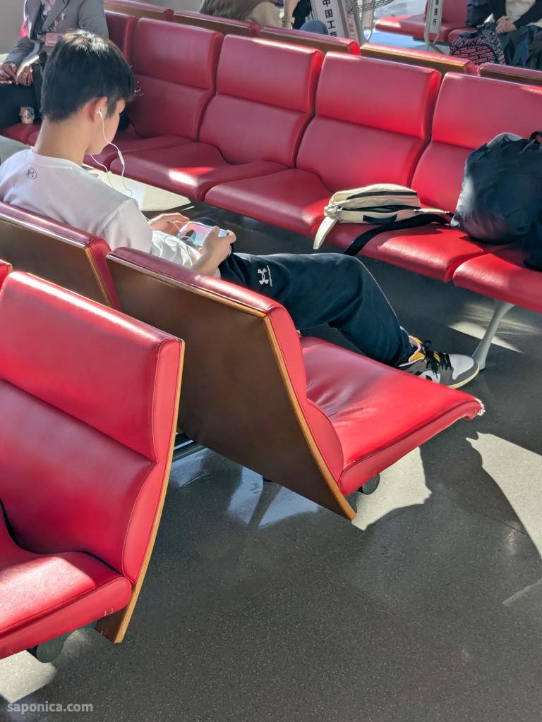 手荷物を預けたら、次はいつも何となくドキドキする手荷物保安検査。ぼくはスムーズに通れたが、娘の手荷物に反応アリ!なんと、かばんの中にがっつり「はさみ」を入れていた。何入れとんねん…小学生くらいの子どもの荷物の中身は出発前にチェックしておいたほうがいいですよ、保護者のみなさん。