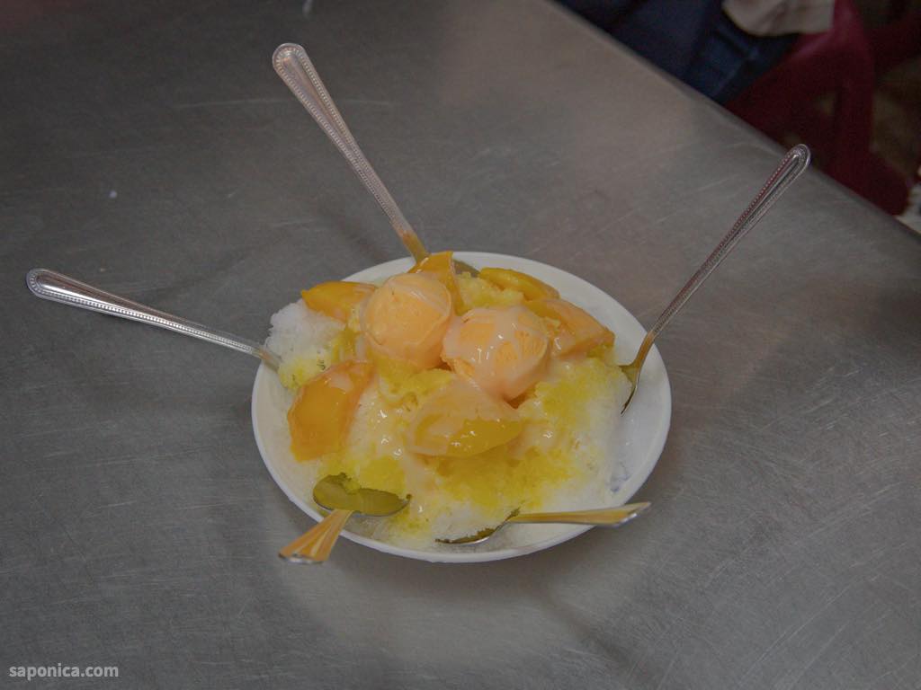 そこでマンゴーかき氷を1つ注文。先ほどタピオカミルクティーを飲んだばかりなのでお腹も減っておらず、5人で1つ。一皿にスプーンをつけてくれた。お店の方には申し訳ない…